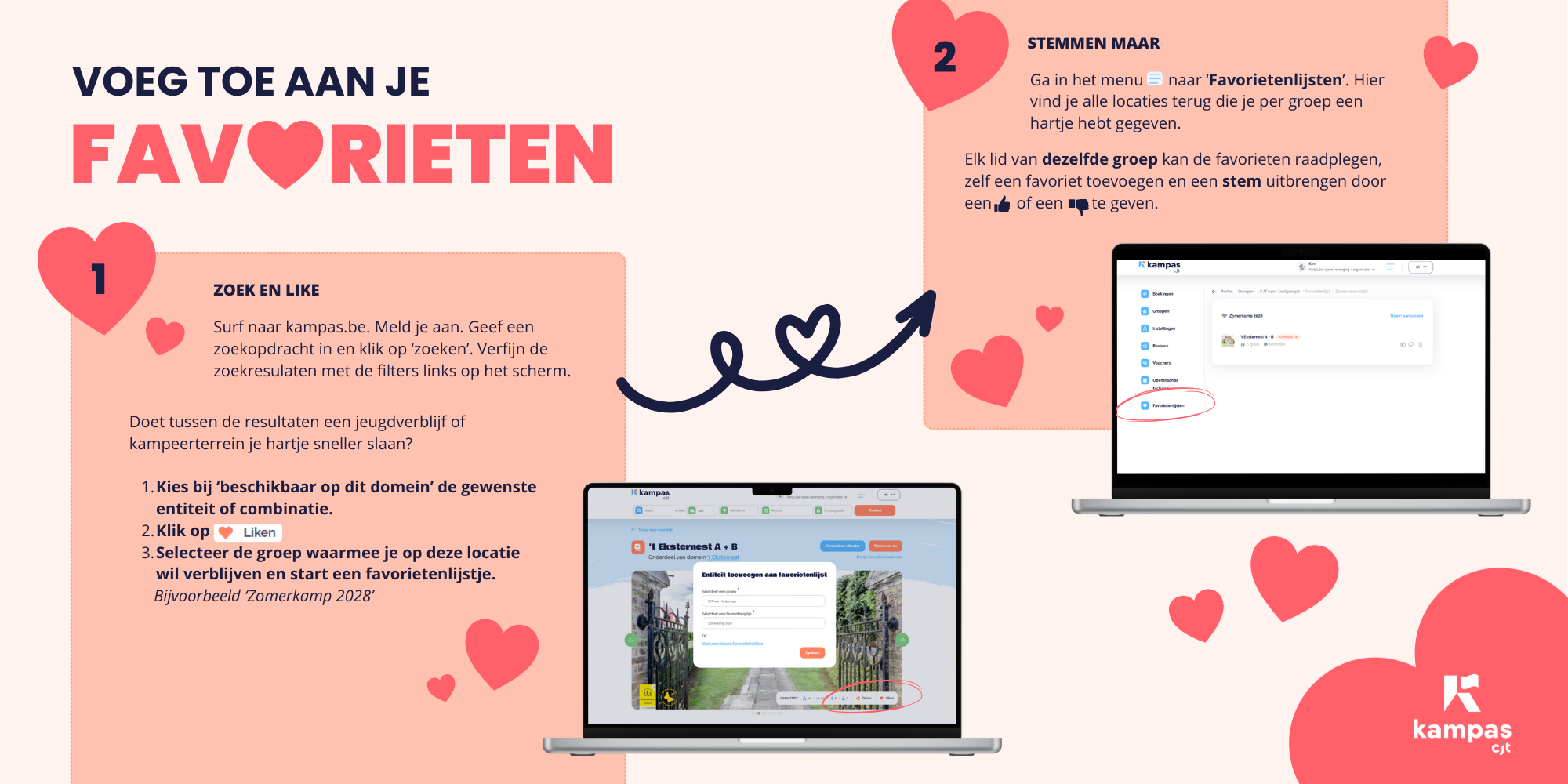 Kampas blijft groeien en veranderen. We voeren regelmatig updates door om het platform vlotter, slimmer en leuker te maken. Daarbij luisteren we graag naar jouw feedback. En wat stond er bovenaan jullie wishlist? Een favorietenlijst om locaties op te slaan.